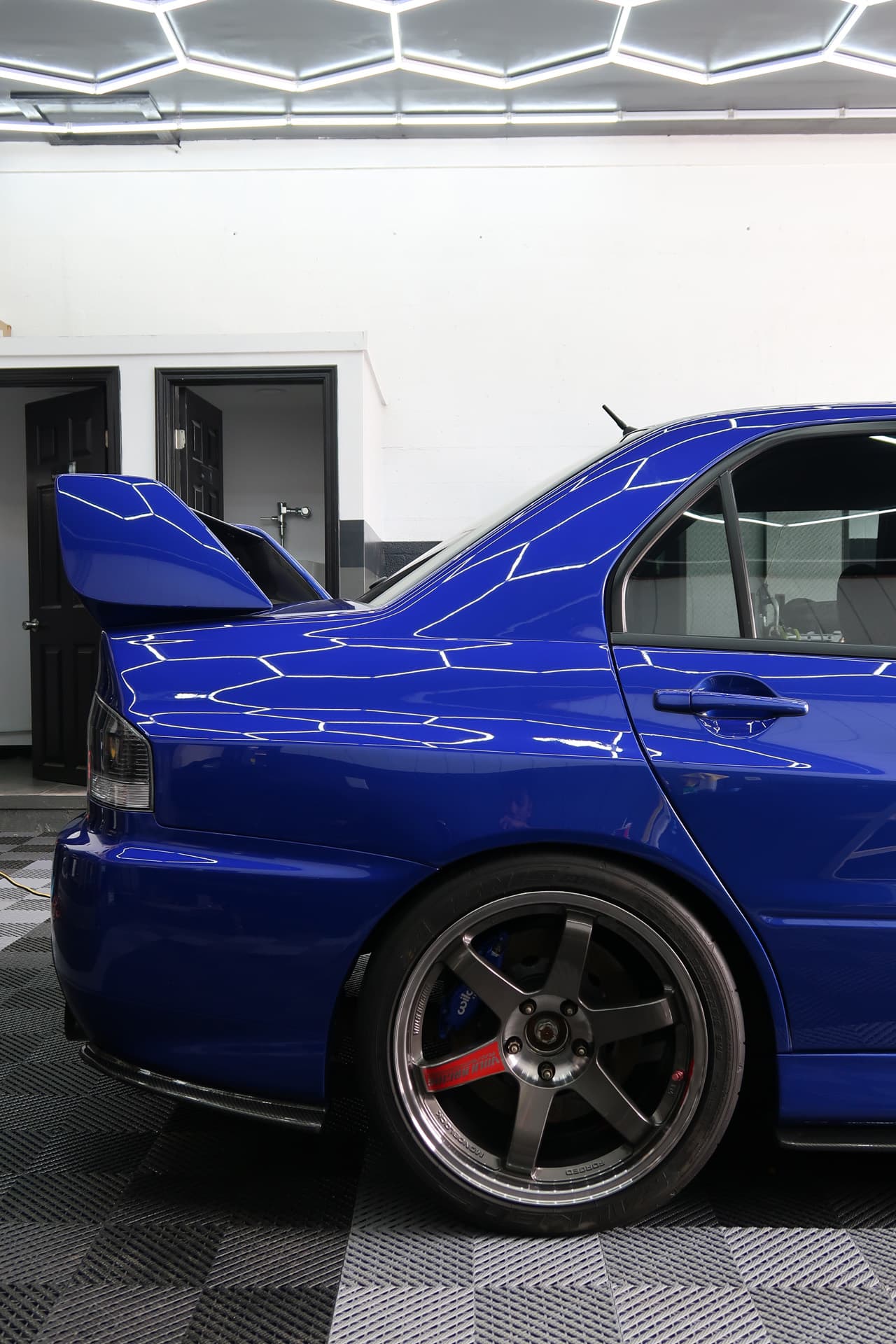 The transformation was incredible. The Evo’s blue paint now pops with a deep, glass-like gloss that highlights every contour of this iconic performance car. Water beads effortlessly, and future maintenance will be a breeze.