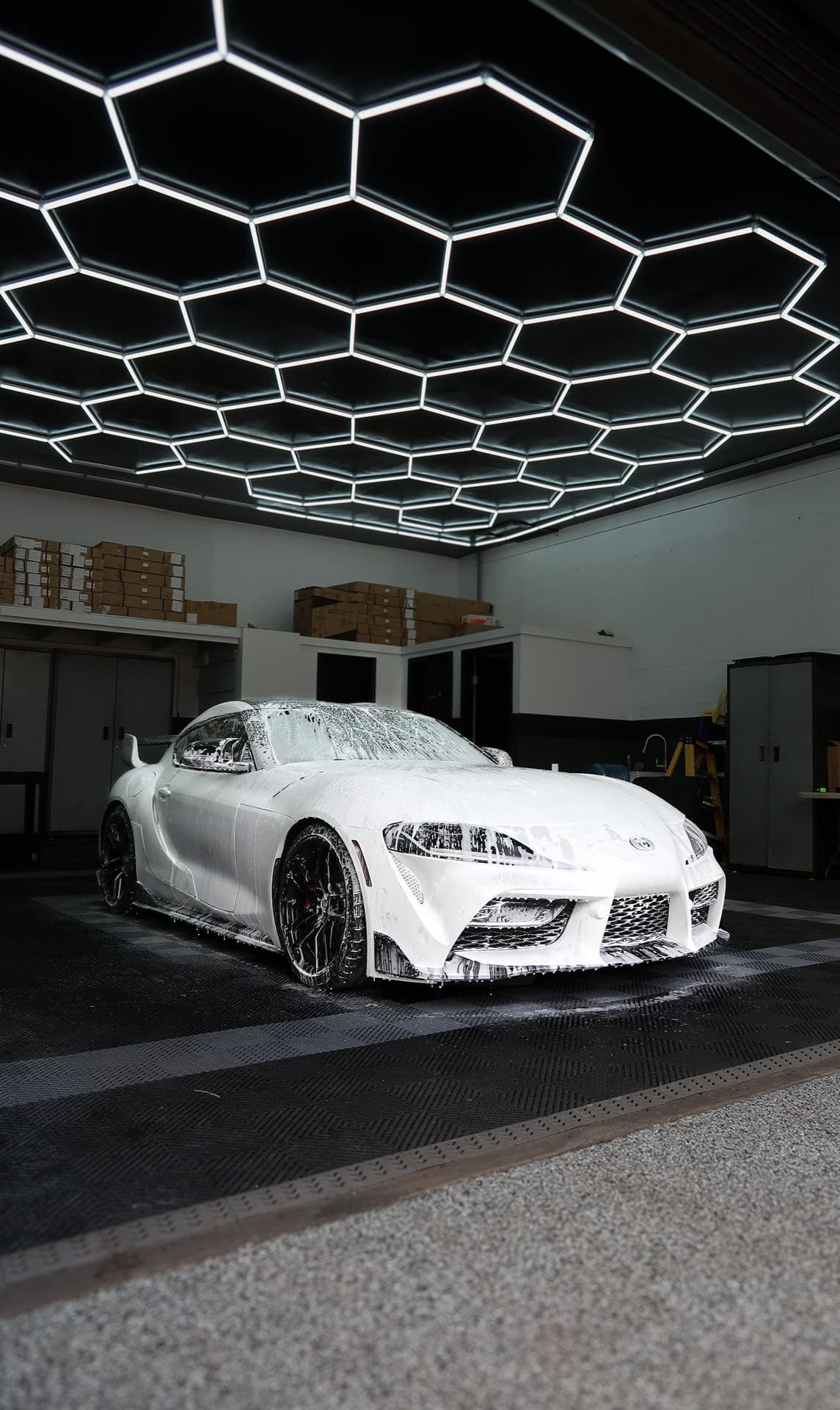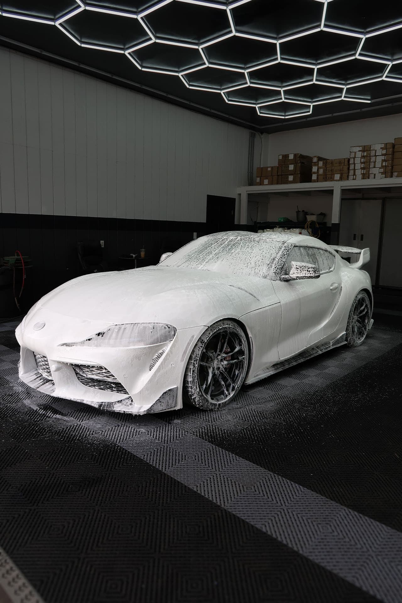 Under our hex lights, the Supra’s white finish now shows a crisp, glassy reflection with tight water beading. The owner can expect easier wash routines and a longer-lasting just-detailed look.